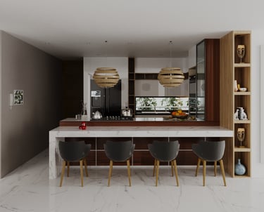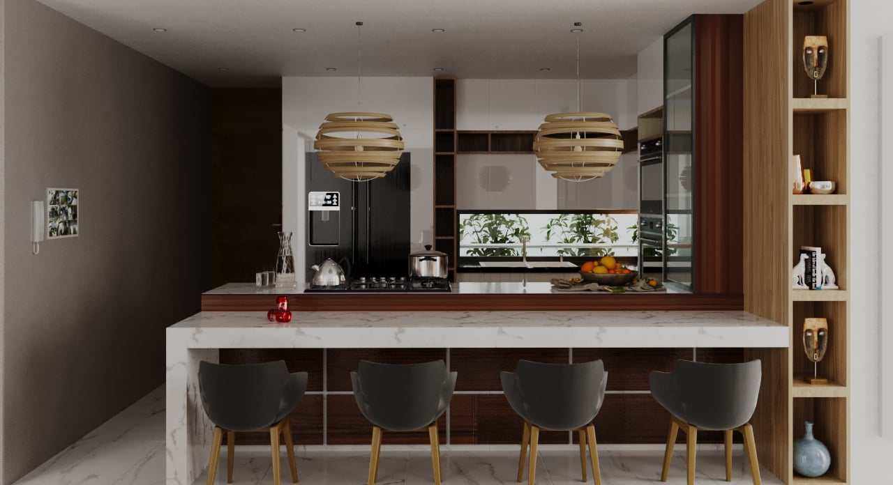 Se realizo tambíen el diseño total interior de sus espacios, como la cocina donde el concepto fue generar un dseño sobrio en tonalidades claras y modernas, que logren simular tambien la naturaleza.