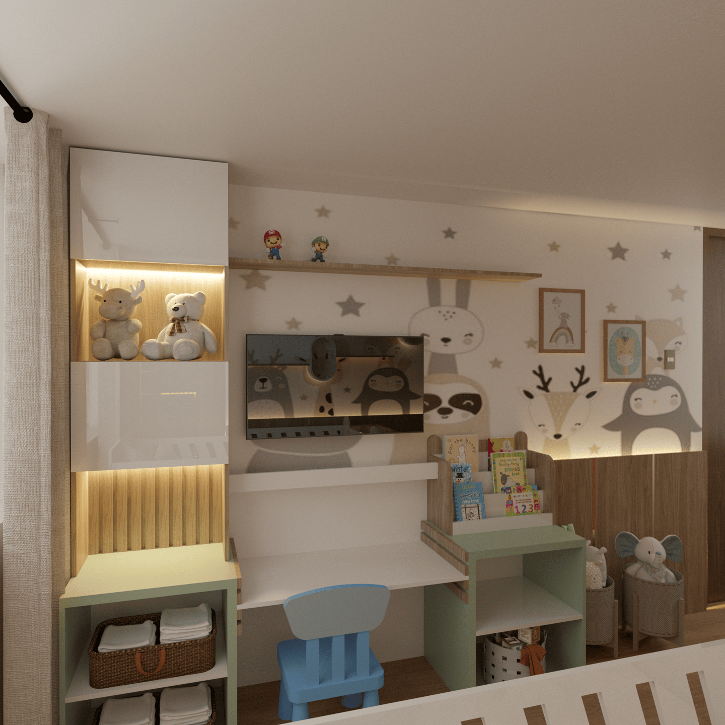 Para los muebles de melamina se utilizó el color Castaño y Agave de la marca Pelikano, asi como tambien Melamina Blanco High Gloss. Como revestimiento en sus paredes se propueso la Misma melamina Castaño Pelikano con ranuras enchapada en colores dorados, asi como tambien un papel tapiz con decoración de animalitos.